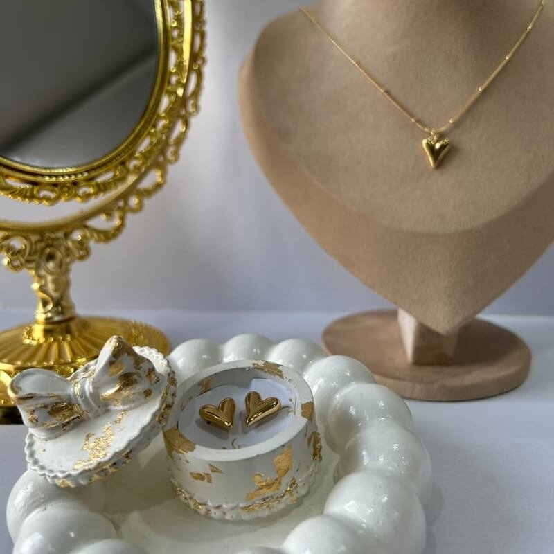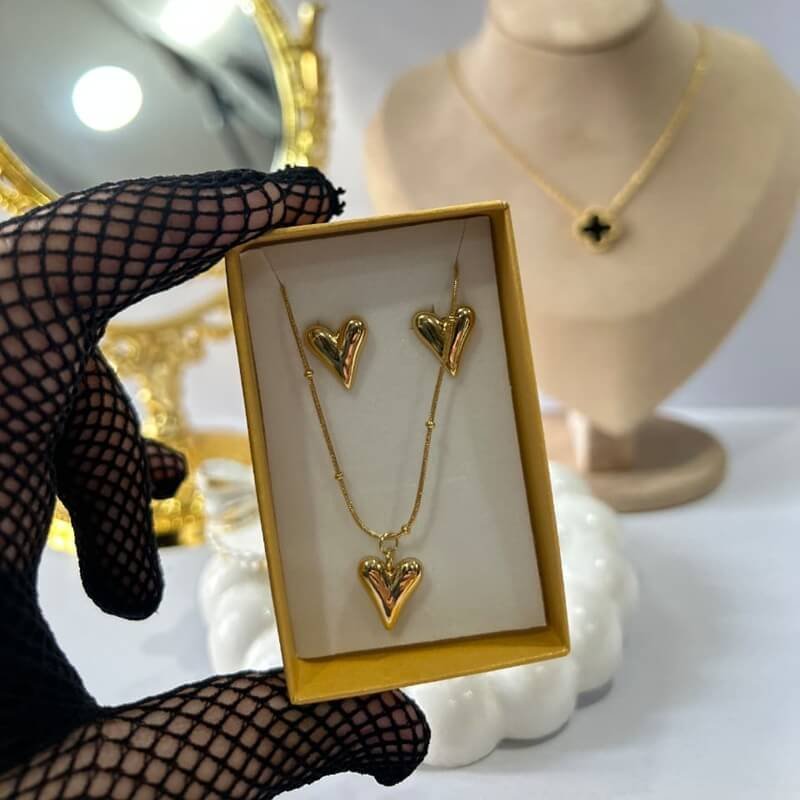 The Aurora Heart Set features a golden anti-tarnish heart-shaped necklace with matching earrings – crafted for timeless sophistication and everyday elegance. ✨