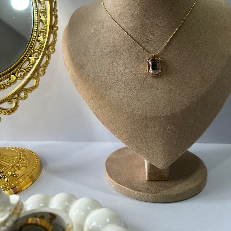 The pendant showcases a soft pale golden-brown stone, cut with gentle precision and framed in a delicate octagon-inspired golden outline. Its neutral tone makes it endlessly versatile, pairing effortlessly with both everyday attire and elevated evening outfits.
