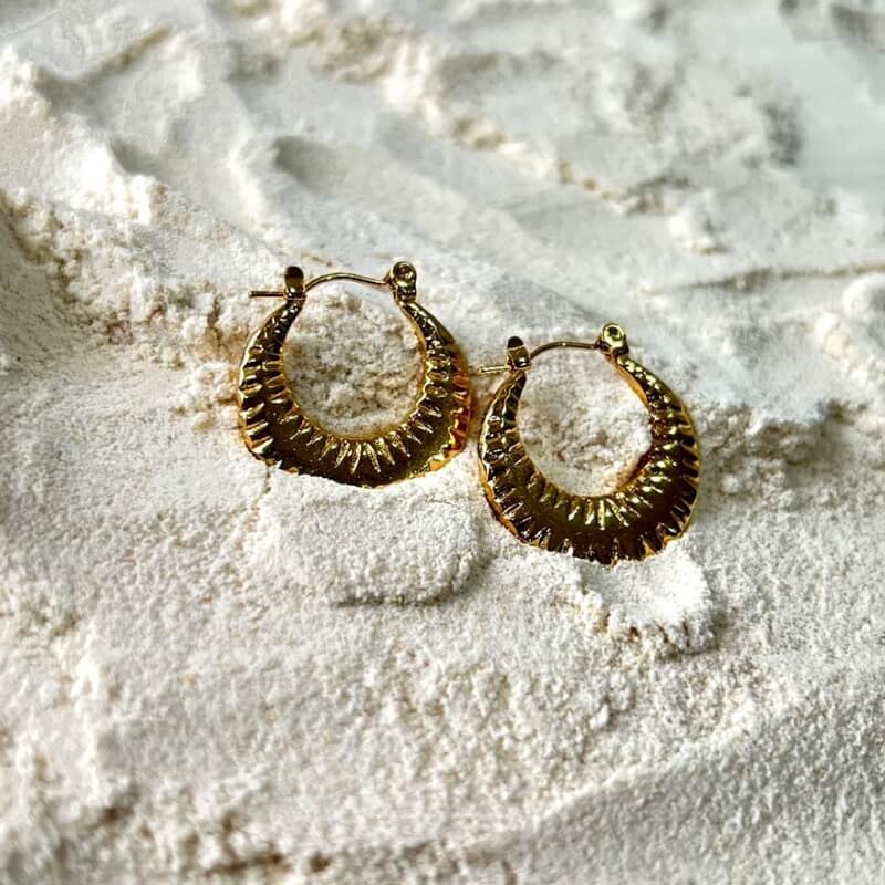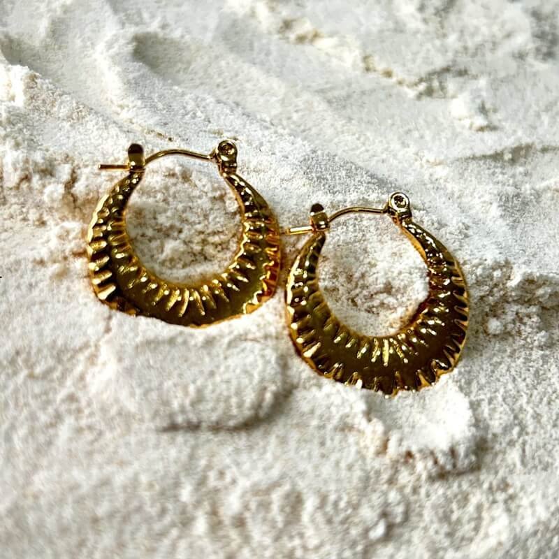 The Solstice Hoops embody the meeting of day and night — a striking crescent silhouette adorned with a sunburst texture. Their intricate golden design catches the light beautifully, making them a statement piece that’s both bold and versatile. Finished with an anti-tarnish coating, they’re made to shine season after season.